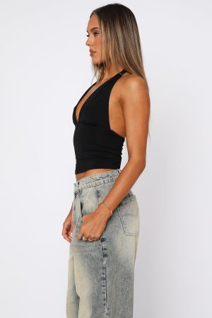 New season trending: halter tops. This top features a halter style neckline with thick elasticated straps. backless design. lined fabric and stretch for an easy slip on design. Pair with booty shorts and a mini bag for a look worthy of your next insta post!