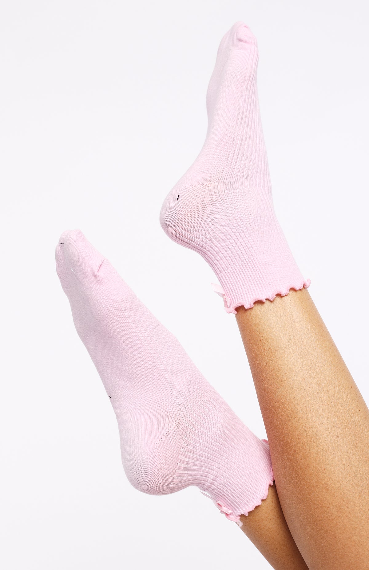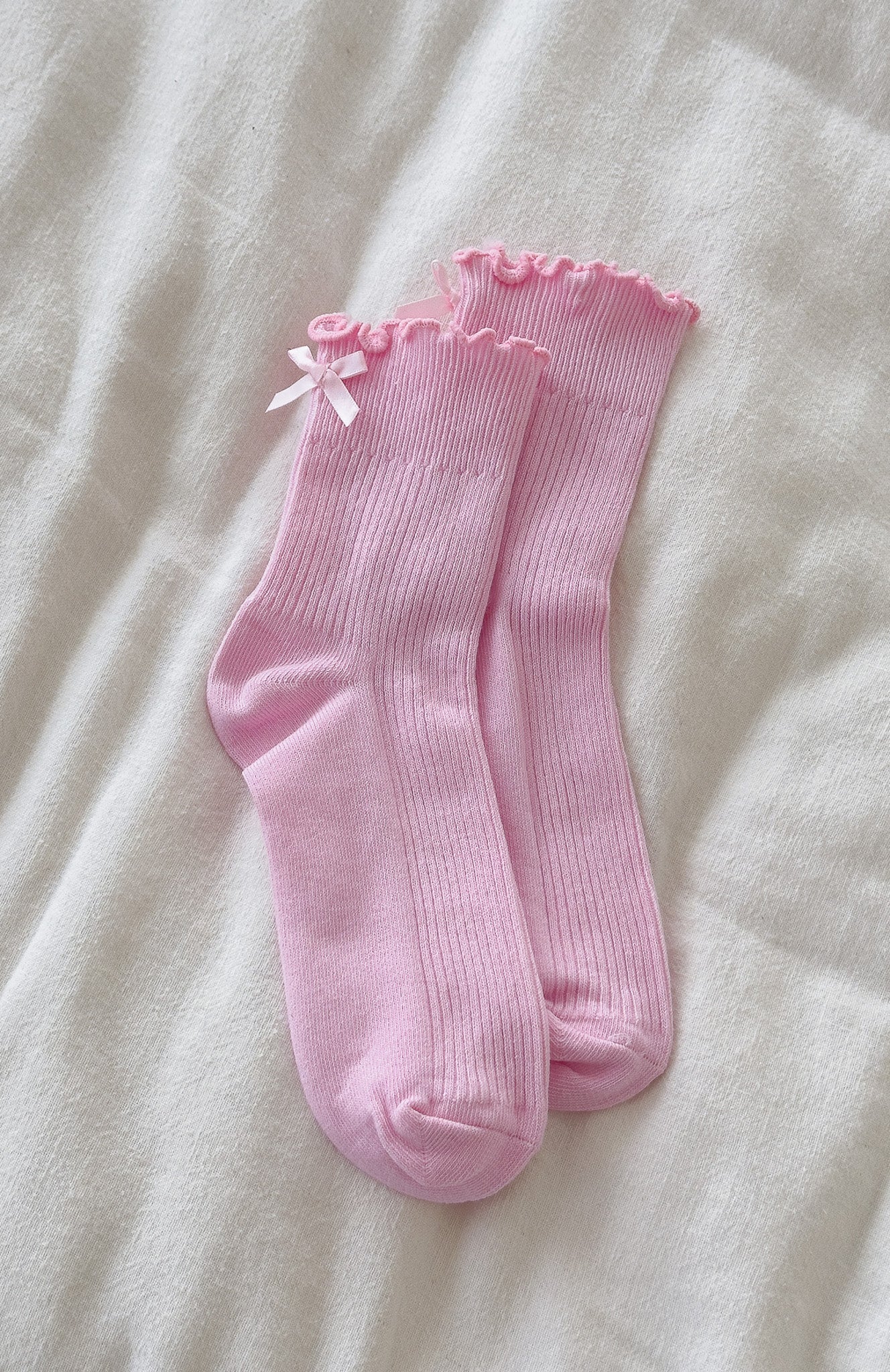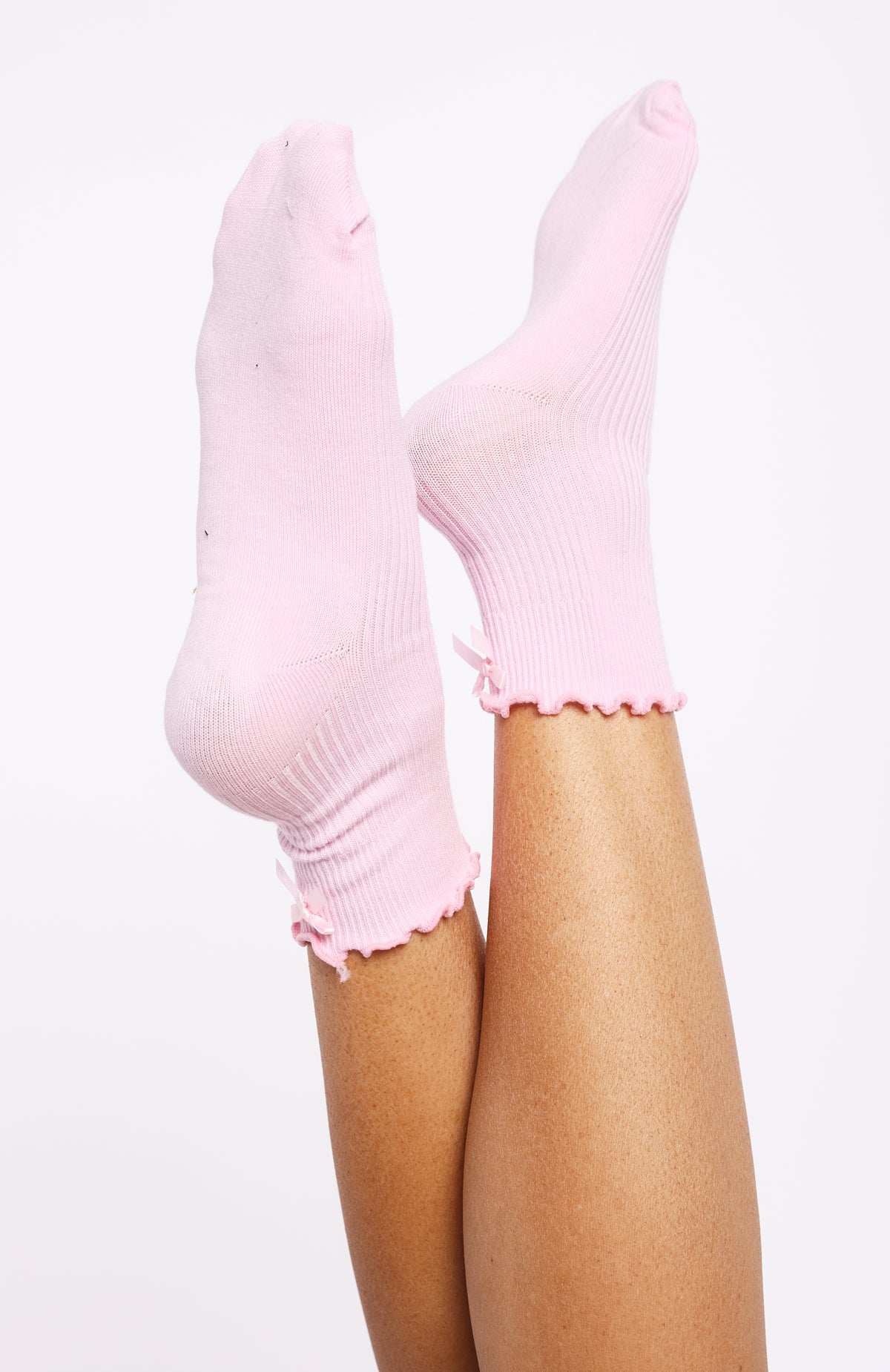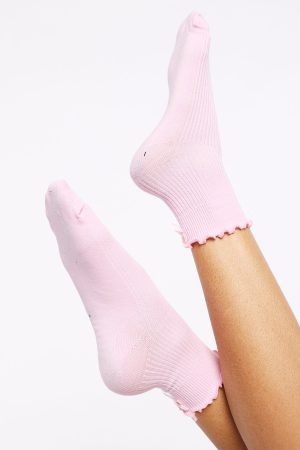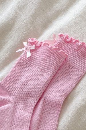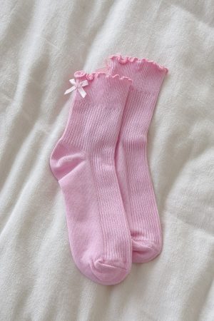 Too cute to resist! The Which One Socks Pink shows off a playful ruffle-hem with a dainty attached bow. while a supportive arch band and ribbed fabrication ensure a secure. comfortable fit. Slip them on to add a sweet. feminine touch to any outfit.
