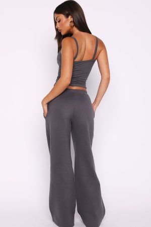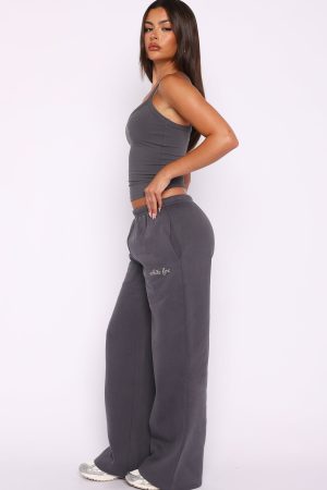 Cosy season calls for the Why Won’t You Wide Leg Sweatpants Volcanic. Features a thin elastic waistband with internal drawstring. relaxed wide-leg silhouette. side pockets and unlined fleece interior. Finished with puff print cursive White fox text side front. Style with the matching Why Won’t You Oversized Drop Shoulder Sweater Volcanic and Why Won’t You Singlet Top Volcanic.