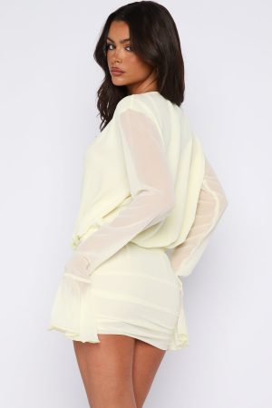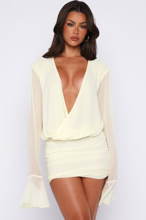 A summer spent well in the Wild Encore Long Sleeve Mini Dress Lemon. Features a daring plunge V-neckline. sheer long sleeves with ruffle cuffs. and a flowing bodice that cinches at the waist before falling into a figure-hugging skirt with stylish side ruching. Fully lined for comfort. it’s finished with a discreet invisible side zipper. Style with kitten heels for a look that transitions beautifully from daytime events to summer nights out.