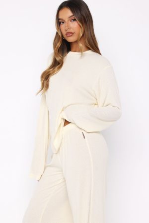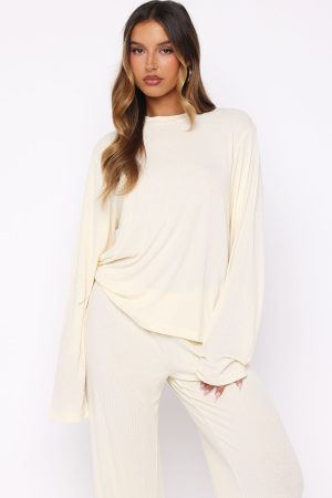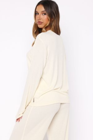 Life unedited the Wish Upon A Star Pyjama Long Sleeve Top in Off White! Featuring a classic crew neckline. slouched shoulders. long sleeves. and a relaxed silhouette. This top is crafted from the softest ribbed. high-stretch fabric you’ve ever felt. Style it with the matching Wish Upon A Star Pyjama Pants in Off White and your favourite slippers. then sit back. unwind. and drape yourself in pure comfort.