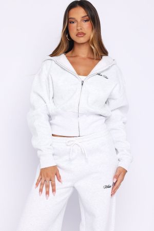 Perfect for lounging or running errands. the Wishing For It Cropped Cinched Zip Front Hoodie Grey Marle is here to keep you comfy. Featuring a centre front zip closure. elasticated ribbed cuffs & ultra thick hem. hood. soft fleeced fabric for extra comfort. cropped length and embroidered logo detailing side front.