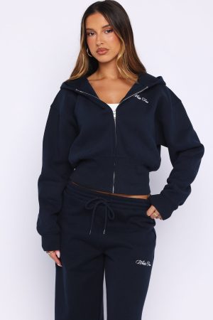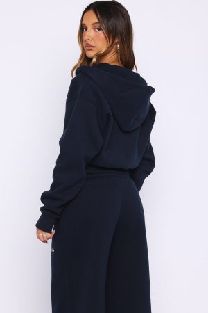 Perfect for lounging or running errands. the Wishing For It Cropped Cinched Zip Front Hoodie Navy is here to keep you comfy. Featuring a centre front zip closure. elasticated ribbed cuffs & ultra thick hem. hood. soft fleeced fabric for extra comfort. cropped length and embroidered logo detailing side front.