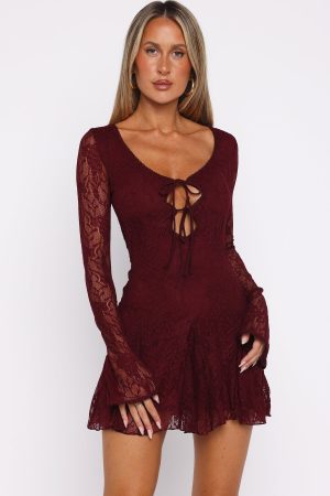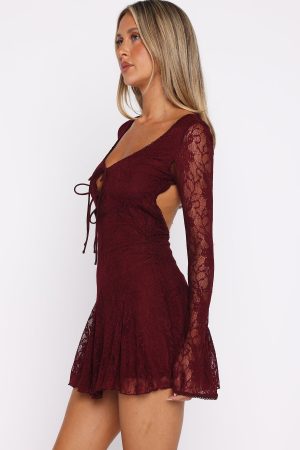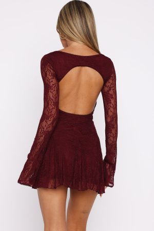 Steal hearts in the With Every Heart Beat Mini Dress in Burgundy. With its scoop neckline. flared long sleeves. and center‑front keyhole tied with self‑bows. this sundress‑silhouette merges sweet charm and bold flair. Fully lined with sheer sleeves and a backless cut. the high‑stretch fabric hugs your figure while letting you move freely. Pair it with clear heels and simple gold jewellery for a look that’s effortlessly romantic and totally unforgettable.
