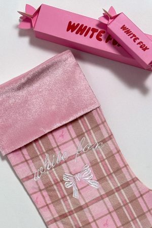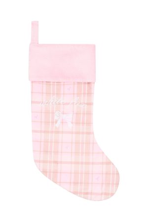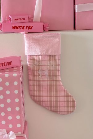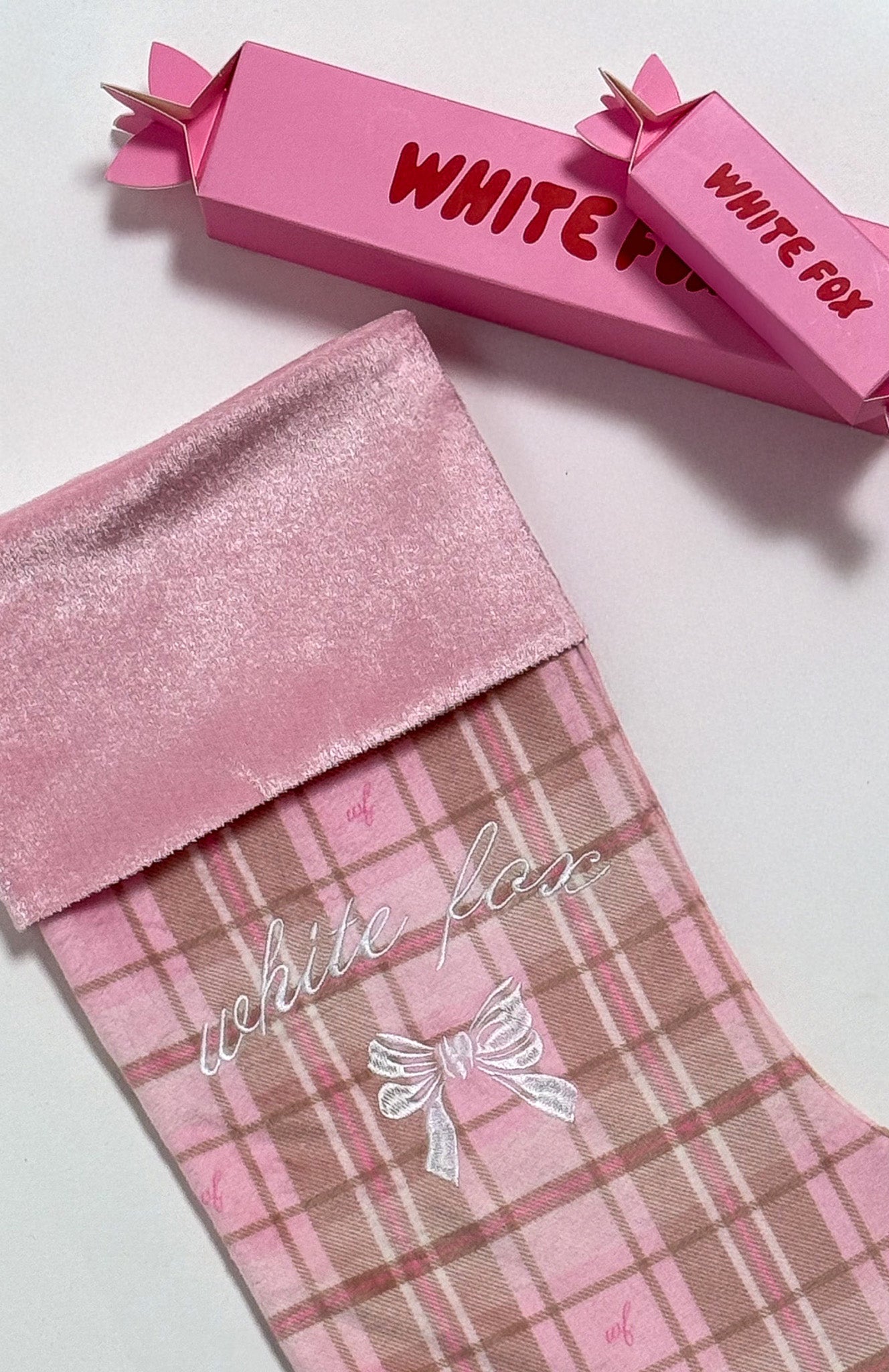 BRB. adding to cart! The Xmas Stocking in Neapolitan Check features a classic stocking shape with a fluffy cuff. embroidered White Fox text. and a sweet bow graphic. perfect for stuffing with festive goodies.