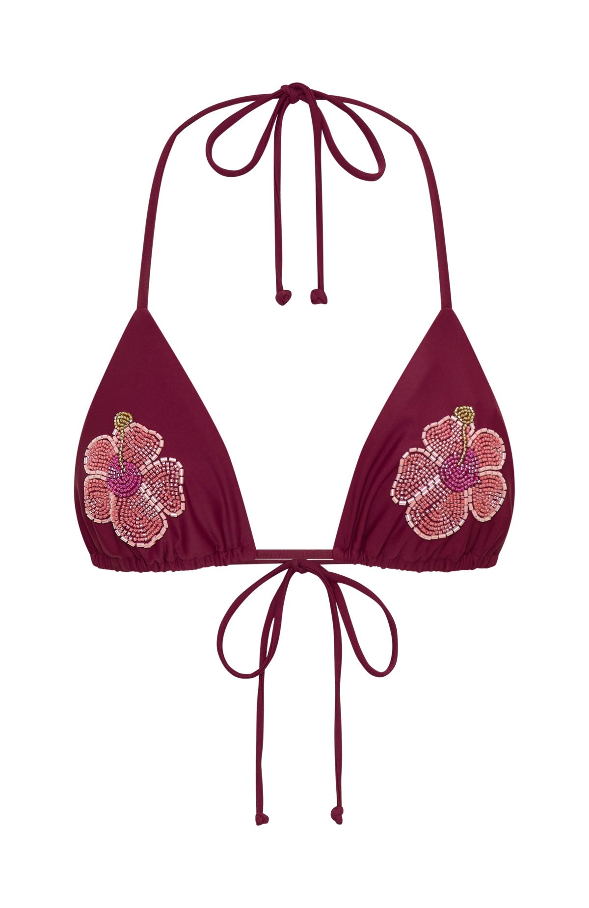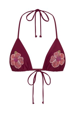 The Yolanda Bikini Top in Sangria has arrived and she’s ridiculously stunning! Features self tie halter straps. triangle design with beaded flower detailing. adjustable coverage with drawstring back strap and removable padding. Finishing off the fit by pairing with the matching Bottoms in Sangria!
