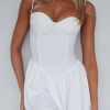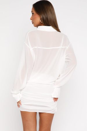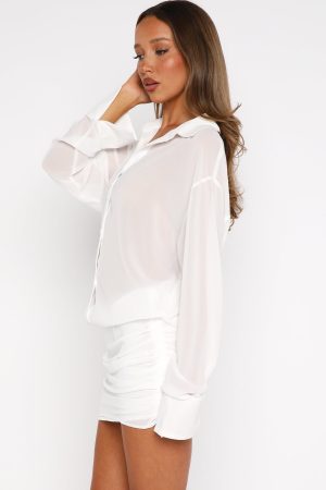 The You’ll Remember Me Mini Dress in White combines classic sophistication with modern allure. Featuring a collar neckline. long sleeves with split cuffs. and a button-front closure. The loose bodice transitions into a figure-hugging skirt with ruched detailing. creating a flattering silhouette. The skirt is fully lined for comfort. while the sheer fabrication adds a touch of allure. An invisible back zipper ensures a seamless fit. Style with simple sandals. and chunky gold jewellery for a stunning fit.