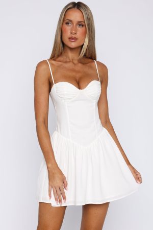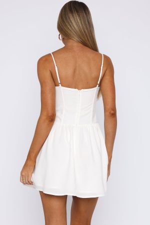 Keep it date night loving in the You’re A Problem Mini Dress White! Features thin thin adjustable straps. bust cups and underwire. boning in bodice. lined fabric. hidden centre back zipper and mini length. Features gold accessories and kitten heels for a cool we love!