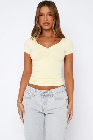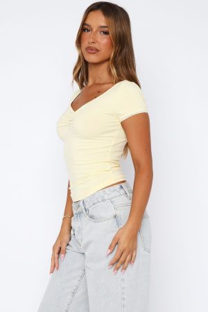 The Yours Truly Top Lemon was made for spring mornings! Features shorts sleeves. a sweetheart neckline. cropped length. lace trim and bow detailing. and unlined. stretch material. Style with low waisted jeans and gold accessories for a trending look!