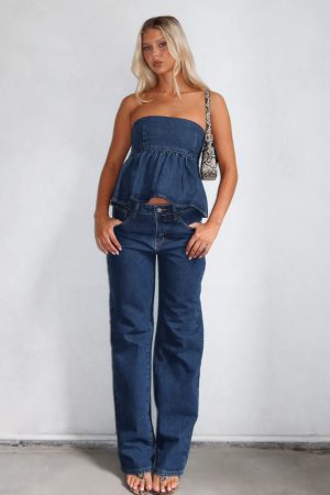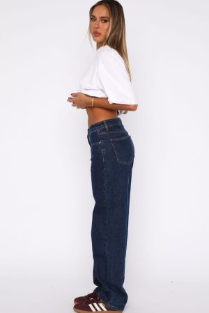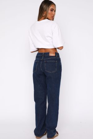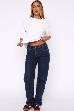 From weekend casual to after dark. our Zara Mid Rise Straight Leg Jeans in Dark Blue have you covered! Featuring a mid rise fit. straight leg design. belt loops. 5 pocket design. front zipper and button closure and WF logo detailing side back. Style with bodysuit and mules for a chic look!